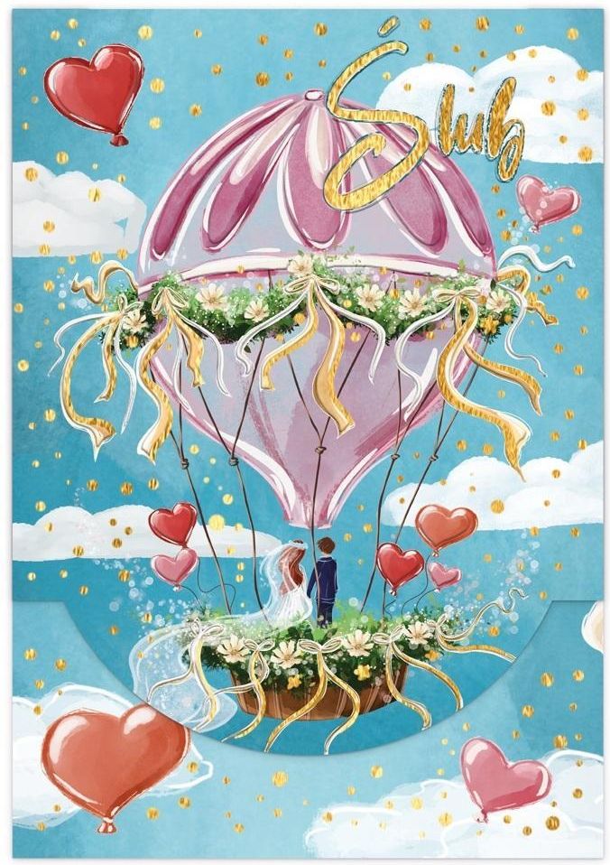 Karnet B6 ślub balon ślubny pionowy z kieszonką Karnet B6 ślub balon ślubny pionowy z kieszonką Karnet z kieszonką na pieniędze w formacie B6, składany w poziomie. Złocony i tłoczony, teksy życzeń w środku. Wydrukowany na wysokiej jakości papierze. W zestawie koperta. Karnet B6 ślub balon ślubny pionowy z kieszonką OKAZJA! Spradź inne nasze ofety!