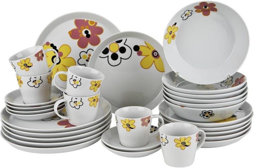 Serwis obiadowy dla 6 osób składający się z 30 elementów. W skład serwisu wchodzi: 6x talerz głęboki 19,5cm, wys.4,5cm 6x talerz deserowy 21,5cm, wys.2,5cm 6x talerz obiadowy 26cm, wys. 2,5cm 6x filiżanka 200ml, wys. 7,5cm 6x spodek 15cm, wys. 2cm Serwis posiada uroczą aplikację z motywem kwiatów. Produkt można używać w zmywarkach i kuchenkach mikrofalowych.
