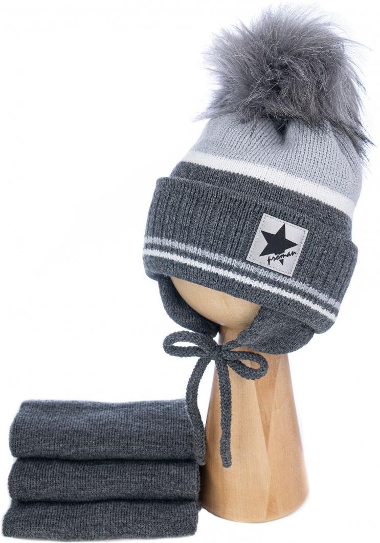 Komplet chłopięcy składający się z czapeczki i szalika. Został wykonany w całości z wysokogatunkowego akrylu. Czapka ciepła, dwuwarstwowa. Posiada osłonki na uszy i wiązania. Szaliczek mięciutki, w kolorze czapki. Komplet idealnie sprawdzi się u maluszka w sezonie jesienno-zimowym. Skład: 100% akryl Obwód głowy: 46 - 50 cm Rozmiar: 2 - 4 lat