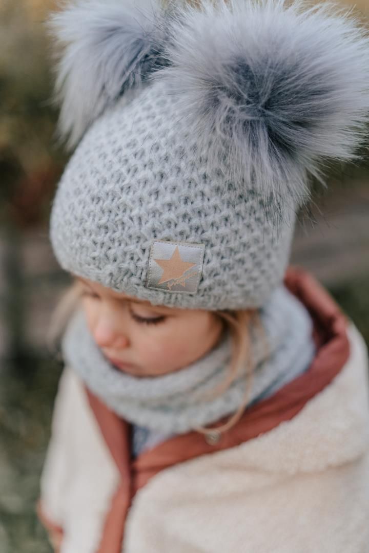 Elegancki komplet dziewczęcy składający się z czapki i komina, Cały zestaw został wykonany z wysokogatunkowego akrylu czesanego, miłego w dotyku, Czapka ciepła, dwuwarstwowa. Posiada modne dwa pompony futrzane i ekskluzywną skórkę, Komin wsuwany przez głowę w kolorze czapki, bardzo dobrze przylega i otula szyję, Idealnie sprawdzi się w sezonie jesienno-zimowym. Skład: 100% akryl czesany Sugerowany wiek: od 2 lat Obwód: Głowa- 48cm-50cm, Komin- szerokość 25 cm, wysokość 25 cm