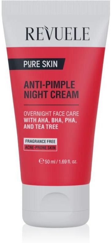 REVUELE ANTI-PIMPLE NIGHT CREAM to specjalistyczny krem na noc, stworzony by sprostać wyzwaniom, jakie stawia przed nami tłusta i mieszana cera skłonna do trądziku. Wykorzystując potężne działanie kwasów AHA, BHA oraz PHA, a także antybakteryjne właściwości olejku z drzewa herbacianego, ten krem intensywnie pracuje w nocy, wspomagając naturalny proces regeneracji komórkowej skóry. Dzięki temu reguluje produkcję sebum, pomaga zapobiegać powstawaniu nowych niedoskonałości i delikatnie złuszcza, co skutkuje wyraźną poprawą tekstury skóry. Krem pomaga także w redukcji śladów po trądziku, wyrównuje koloryt skóry i efektywnie zwęża pory, zapewniając jej gładkość i promienny wygląd na następny dzień. Aplikacja jest prosta i przyjemna: wieczorem, po dokładnym oczyszczeniu skóry, należy nałożyć krem na twarz i szyję, omijając okolice oczu, a następnie delikatnie wmasować do całkowitego wchłonięcia. Pamiętaj o wykonaniu testu wrażliwości przed pierwszym użyciem i unikaniu kontaktu z oczami. W przypadku kontaktu, niezwłocznie przemyj oczy obficie wodą.