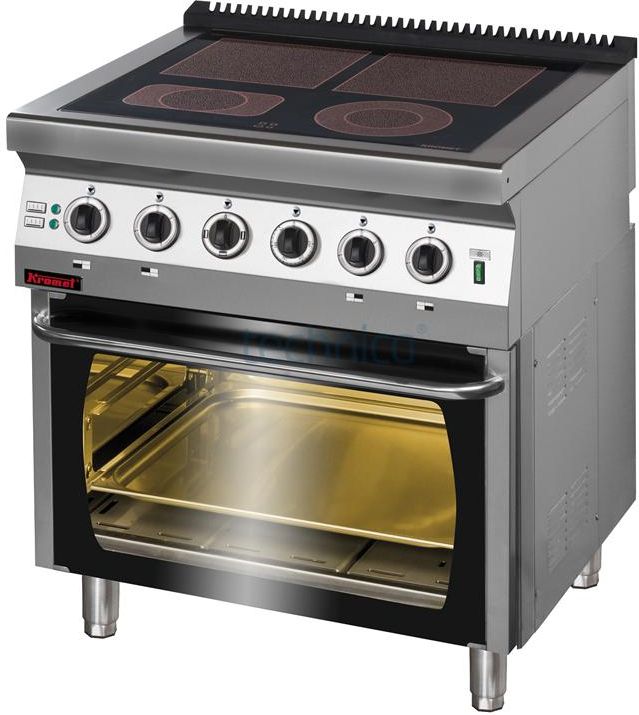 Innowacyjna kuchnie elektryczna ceramiczna z czteroma polami grzewczymi. Zróżnicowana powierzchnia grzejna oraz moc pól umożliwiają dopasowanie intensywności grzania do indywidualnych potrzeb użytkownika. Pola sterowane oddzielnie za pomocą kilkustopniowych pokręteł. Same pokrętła charakteryzują się nowoczesnym i ergonomicznym wykonaniem – posiadają pierścienie uszczelniające zapewniające także dodatkowe bezpieczeństwo i higienę pracy. Cechy przedmiotu Moc płyt: 2×4,0kW + 1×2,1kW+1×2,0kW= 12,1kW Moc piekarnika: 6,5kW Napięcie zasilania: 3NPE 230/400V 50Hz Ilość pól: 4 Wymiary: 800×700×900[mm] Wymiary komory: 695×550×310 [GN 2/1] Piekarnik grzanie: góra, dół, góra-dół Zakres temperatur: płynna regulacja od 50 o C do 250 o C Profesjonalne piekarniki Kromet niezawodne i proste w użyciu Posiadamy szeroką gamę piekarników, zarówno gazowych, jak i w wersji elektrycznej. Najważniejsze cechy duże pokrętła dla łatwej regulacji wielkości płomienia, zabezpieczenie antybryzgowe na regulatorach zwiększające higienę, możliwość łatwego łączenia linii 700 na włos, wolnostojące i do łączenia z topem, ergonomiczne pokrętła z pierścieniami uszczelniającymi, płyta górna wykonana ze stali nierdzewnej o grubości 1,5 mm, duża żywotność elementów grzejnych, ergonomiczny uchwyt piekarnika, ruszt prętowy w zestawie, regulowane, nierdzewne nogi umożliwiające poziomowanie wyrobu, drzwi szklane umożliwiające podgląd obrabianych potraw.