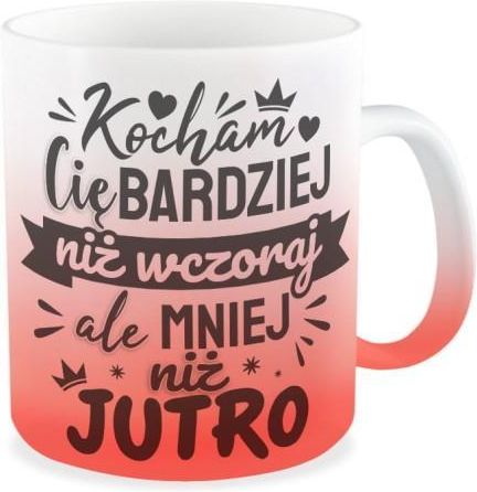 Kubek kocham cię bardziej niż wczoraj ale mniej niż jutro Uwaga, GRATIS! Każdy kubek umieszczany jest w ozdobnym kartoniku! Materiał: CeramikaPowłoka: wielowarstwowa, utwardzanaPojemność: 330 mlWysokość: 93 mmKolor kubka: biały, dymiony czerwonyNadruk: Pełnokolorowy, niewyczuwalny w dotykuGrafika: …