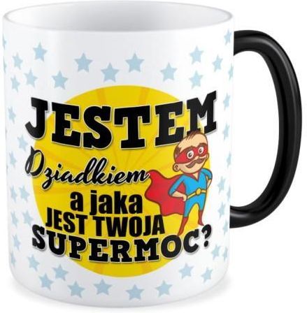 Kubek jestem dziadkiem, a jaka jest Twoja supermoc? Uwaga, GRATIS! Każdy kubek umieszczany jest w ozdobnym kartoniku! Materiał: CeramikaPowłoka: wielowarstwowa, utwardzanaPojemność: 330 mlWysokość: 93 mmNadruk: Pełnokolorowy, niewyczuwalny w dotykuGrafika: max. 200 - 90 mm Magia kubka:Po zalaniu gorącą cieczą na kubku pojawia się stopniowo wybrana grafika, która w normalny jego stanie zakryta jest kolorem czarnym. Po wystudzeniu zalanej cieczy kubek ponownie staje się czarny. Grafika przykryta jest w około 90%, to jeden z lepszych parametrów dostępnych na rynku. Ze względu na specyfikę powłoki zmieniającej kolor, kubek nie nadaje się do mycia w zmywarce PRODUCENT: fajneKUBKIPRODUKT POLSKI