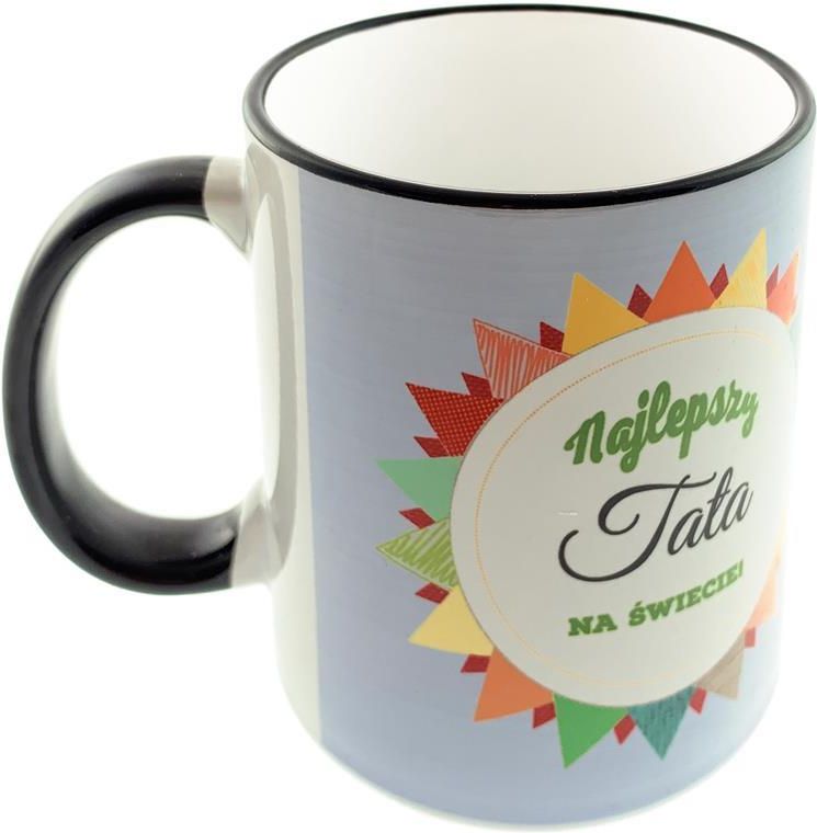 Kubek w kolorze białym z kolorowym nadrukiem, z czarnym uchem i obwódką. Napis: Najlepszy tata na świecie Kubek nadaje się do mycia w zmywarkach. Materiał: ceramika Wysokość: 90 mm Średnica górna/dolna: 75/70 mm