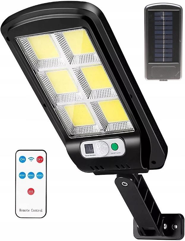 Lampa uliczna z czujnikiem zmierzchu i ruchu Ekologiczny i energooszczędny sposób oświetlenia Cechy produktu: Lampa zasilana energią słoneczną - jest ekologiczna i energooszczędna, zużywa 10 razy mniej energii niż tradycyjne oświetlenie Najnowszej generacji panel solarny monokrystaliczny - silikonowy zapewnia ładowanie akumulatora nawet w pochmurne dni. Akumulator o sprawia, że latarnia może świecić całą noc - w zależności od pogody. Czujnik zmierzchu (w solarze) załączy lampę po zmroku i wyłączy o świcie. Wyposażona w diody COB Idealnie oświetli parking, plac budowy, ulicę, alejkę parkową. Nadaje się przed garaż, magazyn, w gospodarstwach rolnych i agroturystyce. Obudowa wykonana z tworzywa Wbudowany czujnik światła / zmierzchu Wbudowany czujnik ruchu Lampa jest wodoodporna i odporna na wstrząsy Instalacja nie wymaga okablowania, lampa posiada wbudowany akumulator 3 tryby świecenia W zestawie pilot, stojak oraz śruby do montażu Specyfikacja: Kąt wychwytywania ruchu: 120° Barwa światła: zimna biała Wymiary lampy: 23 x 11,5 cm Długość z uchwytem: 37 cm 6 paneli świetlnych COB Czas świecenia przy pełnym naładowaniu: do 8 godzin Tryby świecenia: MODE1 - Lampa jest wyłączona, po zmierzchu i wykryciu ruchu włącza się pełna moc MODE2 - Lampa po zmroku włącza 30% mocy, po wykryciu ruchu włącza się pełna moc MODE3 - Lampa po zmroku włącza 50% mocy
