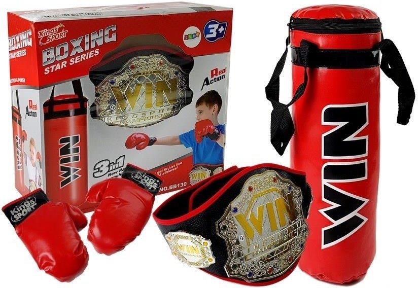 Zestaw Bokserski Worek Rękawice Pas Jeżeli Twoje dziecko jest zainteresowane sportem , zwłaszcza walkami bokserskimi to nie ma na co czekać. Doskonałym prezentem będzie nasz zestaw Mocny trening i niezapomniana zabawa to bardzo dobry sposób na tracenie nadmiernej energii. Poprawi to u dziecka koordynację ruchową, szybkość, zwinność oraz nauczy się unikać ciosów. Zestaw utrzymany jest w klasycznej, czarno-czerwonej kolorystyce. Wykonano z najmniejszymi detalami, co w połączeniu z materiałami najwyższej jakości czyni zabawkę bardzo solidną i wytrzymałą. Znajdujące się w zestawie rękawice świetnie pasują do kompletu, a pas ze złotymi elementami i kolorowymi diamencikami, otrzyma zwycięzca po udanym treningu lub wesołej walce. Zestaw bokserski zawiera: - worek bokserski - rękawice bokserskie - zapinane na rzep - pas zwycięzcy Wymiary worka do boksu: wysokość - 37 cm średnica - 15 cm Długość pasa: 100 cm Wymiary pudełka: 40 cm x 36 cm x 17,5 cm Zestaw przeznaczony jest dla dzieci powyżej 3. roku życia. Zabawki posiadają certyfikat CE i są zgodne z normą EN 71. Zestaw zapakowany w kolorowe pudełko, dzięki czemu nadają się na prezent dla dziecka.