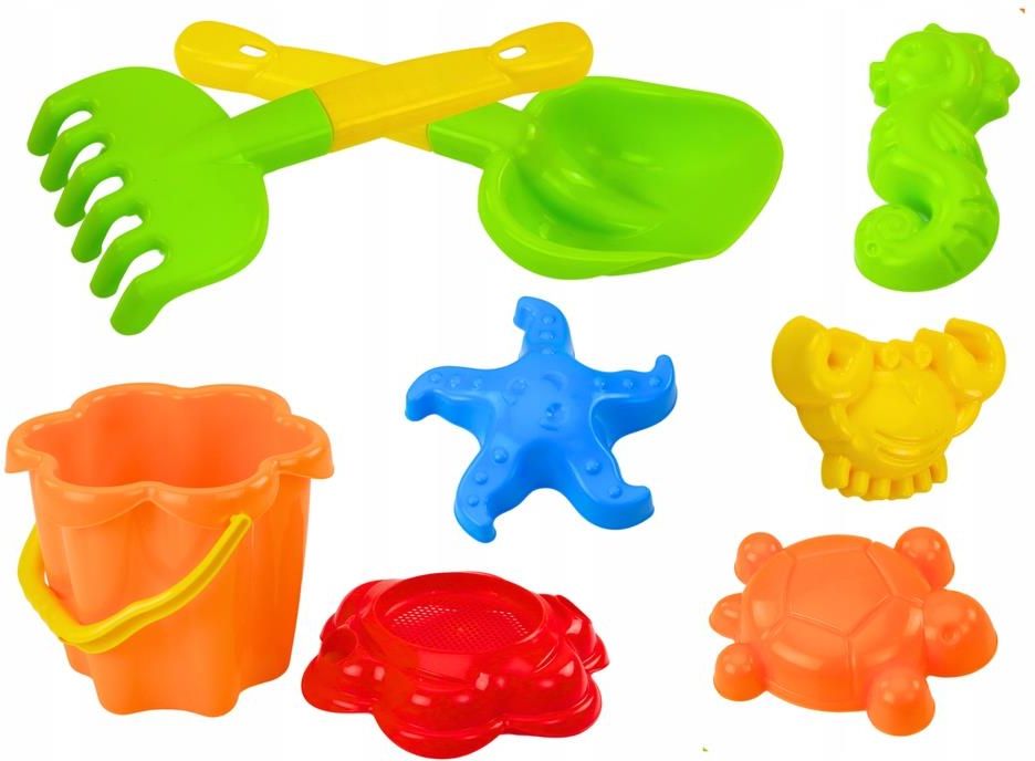 Zestaw dla dzieci Do Piasku Na plażę Wiaderko Sitko Foremki 8 Ele Kolorowy 5900992008907 Zestaw Do Piasku Wiaderko Sitko Foremki 8 El Kolorowy Zestaw do piasku 8 elementów to idealny komplet akcesoriów, który dostarcza dzieciom wiele radości i kreatywnej zabawy na plaży lub w piaskownicy. W skład zestawu wchodzi wiaderko z przykrywką, która ma kształt kwiatka. Przykrywka pełni również funkcję sitka, co pozwala na przesiewanie piasku, dając dzieciom dodatkową możliwość eksperymentowania i tworzenia różnych tekstur i wzorów w piasku. W zestawie znajduje się także łopatka, która jest podstawowym narzędziem do kopania, przenoszenia i formowania piasku. Łopatka pozwala dzieciom na budowanie zamków, tworzenie tuneli i innych piaskowych struktur. W połączeniu z grabkami, które również są częścią zestawu, dzieci mogą wygładzać powierzchnię piasku, tworzyć różnorodne wzory oraz odkrywać zakopane skarby. Niezwykle atrakcyjną częścią zestawu są cztery foremki w kształtach morskich stworzeń. Foremki są w kształcie konika wodnego, rozgwiazdy, kraba oraz żółwia. Cały zestaw utrzymany jest w różnorodnych jaskrawych kolorach które przykuwają uwagę dziecka. Został zaprojektowany z myślą o małych odkrywcach, którzy uwielbiają spędzać czas na świeżym powietrzu, bawiąc się piaskiem i rozwijając swoją kreatywność. Wymiary wiaderka z przykrywką 23cm x 21cm x 20,5cm Wymiary łopatki 25cm x 9cm Wymiary grabek 22,5cm x 10,5cm Wymiary opakowania 30cm x 21cm x 21cm Posiada certyfikat CE, ponadto jest zgodny z normą EN71. Przeznaczony dla dzieci powyżej 1 roku życia. Ostrzeżenie!: Nieodpowiednie dla dzieci w wieku poniżej 1 lat Wiek: +1