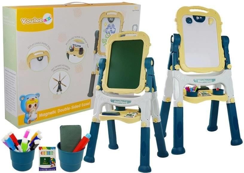 Tablica dwustronna magnetyczna i kredowa w kolorze niebieskim Wielofunkcyjna tablica dwustronna w kolorze niebieskim to świetny do dodatek do pokoju każdego malucha, który lubi rysować. Z jednej strony magnetyczna, z drugiej kredowa, pozwoli dziecku rozwijać zdolności plastyczne, wyobraźnię oraz precyzję rąk. Stojąca tablica doskonale komponuje się z różnymi aranżacjami dziecięcych pokoi. Korzyści z rysowania na tablicy to pozytywny wpływ na rozwój dziecka oraz doskonała forma ekspresji. Funkcjonalna taca z kubeczkami umieszczona pod tablicą gwarantuje, że mały artysta zawsze będzie miał pod ręką kolorowe pisaki oraz inne niezbędne akcesoria. Dzięki możliwości obrotu o 360 stopni, tablica może być swobodnie przekręcana na drugą stronę. Nad tablicą znajduje się haczyk umożliwiający zawieszenie kartki papieru, co umożliwia użycie różnych typów materiałów do rysowania i malowania. W zestawie dołączono 8 zmazywalnych pisaków (czerwony, granatowy, różowy, czarny, niebieski, fioletowy, zielony, żółty), 6 sztuk kolorowej kredy, dwa magnesy, uchwyt do kredy oraz gąbkę do ścierania tablicy. Wymiary tablicy wynoszą około 37,5 cm x 39 cm x 87 cm, zaś powierzchni do pisania: 24,5 cm x 34,5 cm. Wysokość od podłoża do tablicy to 57 cm, natomiast wymiary opakowania: 59 cm x 43,5 cm x 11,5 cm. Produkt przeznaczony dla dzieci powyżej 3 roku życia, zgodny z normą EN71. EAN: 5903802456844