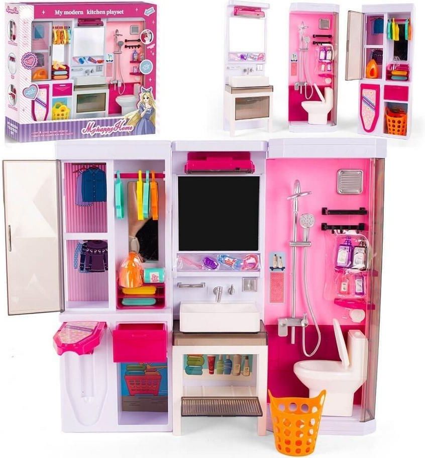 Stylowy i kolorowy zestaw łazienkowy do domku dla lalek to idealna propozycja dla każdej małej miłośniczki zabawy w dom. W komplecie znajdują się realistyczne meble i akcesoria: prysznic, toaleta, umywalka z lustrem, pralka, szafki oraz półki z kosmetykami. Całość wykonana została z trwałego …