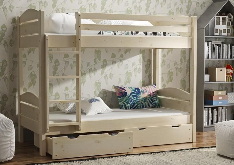 Łóżko piętrowe TOLA 90X200 + szuflady ŚWIERK Łóżko TOLA powstało na potrzeby osób, dla których bezpieczeństwo, solidność, trwałość wykonania oraz praktyczność są cechami najważniejszymi jakimi powinno się charakteryzować łóżko piętrowe. Łóżko piętrowe TOLA charakteryzuje się wysoką przestrzenią pomiędzy ramą dolną,a górną łóżka. Dzięki masywnym przekrojom i stabilnej drabince TOLA jest wysoko ceniona przez naszych klientów. Zastosowane barierki zabezpieczające, o wysokości 15 cm, chronią przed wypadnięciem z górnej powierzchni spania. Zalety Całość wykonana z litego drewna świerkowego. Barierki zabezpieczające o wys. 26 cm (z tyłu i z przodu). Zaokrąglone krawędzie chroniące przed urazami. Solidna i trwała konstrukcja łóżka. Wytrzymała drabinka. Masywne nogi – 4,5 x 9 cm. Przekrój desek – 14 x 2,8 cm. Łóżko dwukrotnie zabezpieczone lakierem wodnym spełniającym certyfikat PN-EN 71. Wykonane ręcznie z drewna świerkowego, skręcane solidnie za pomocą śrub mosiężnych oraz kołków drewnianych. Łatwy montaż i czytelna instrukcja. Łóżko spełnia normy PN-EN 747-1 oraz PN-EN 747-2, w zakresie krytycznych wymagań wytrzymałościowych i bezpiecznych rozwiązań konstrukcyjnych. W skład łóżka wchodzą -konstrukcja z litego drewna świerkowego z barierkami zabezpieczającymi łóżka górnego -drabinka -stelaże pod materace -gwarancja 24 miesiące -instrukcja -komplet śrub, kołków oraz kluczy. -dwie głębokie i pojemne szuflady na kółkach całkowicie wysuwane spod łóżka Łóżko z drewna świerkowego - Dlaczego? - Drewno jest w 100% materiałem ekologicznym nie posiadającym żadnych udoskonalaczy. - Drewno świerkowe jest bardziej szlachetniejsze od drewna sosnowego ze względu na niską zawartość żywicy, przez co produkt jest trwalszy. - Drewno świerkowe posiada więcej usłojeń co sprawia,że produkt ładniej wygląda. WYMIARY: Powierzchnia do spania: 90x200 cm Wymiary zewnętrzne: 104x209 cm Wysokość szczytów: 170 cm Wysokość ramy dolnej łóżka: 37 cm Wysokość ramy górnej łóżka bez zabezpieczenia: 138 cm Szerokość wejścia: 33 cm Przestrzeń między ramami łóżka: 87 cm Głębokość szuflad: 18 cm Długość wewn. szuflad: 78 cm Szerokość wewn. szuflad: 89 cm Dodatkowe informacje: Głębokość w ramie łóżka pod stelaż i materac wynosi 11 cm. Wysokość ramy dolnej łóżka, mierzona od podłogi wynosi 37 cm. Wysokość ramy górnej łóżka bez zabezpieczenia, mierzona od podłogi wynosi 138 cm. Wysokość barierki zabezpieczającej od ramy łóżka wynosi 26 cm. UWAGA! WERSJA ŁÓŻKA Z SZUFLADAMI DOSTĘPNA RÓWNIEŻ W KOLORZE BIAŁYM I SZARYM!