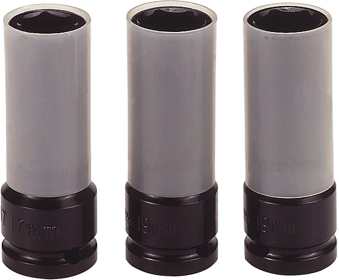 Zestaw 3 1/2" nasadek wykonanych ze stali chromowo-molibdenowej. Do nakrętek kół. Wyposażone w tulejkę chroniącą przed uszkodzeniem aluminiowych obręczy kół. Cienkościenna konstrukcja umożliwiająca dostęp do miejsc trudno dostępnych Nasadki wyposażone w tulejkę chroniącą przed uszkodzeniem aluminiowych obręczy kół Konstrukcja zgodna z normą DIN, z kołkiem i pierścieniem zabezpieczającym Nasadki ze stali chromowo-molibdenowej, do elektronarzędzi Otwór pod pierścień i kołek zabezpieczający na żeńskiej końcówce w celu pewnego zamocowania nasadki na chwycie klucza pneumatycznego Rozmiar: 17, 19, 21 mm