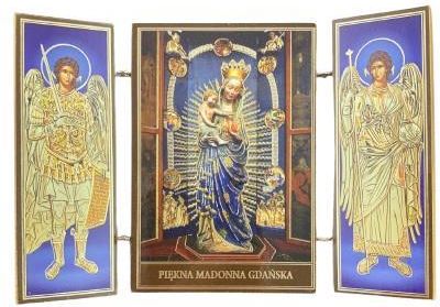 Drewniany tryptyk wykonany na desce; w centrum wizerunek Pięknej Madonny Gdańskiej, po bokach - Archaniołów Michała i Gabriela. Do postawienia w wybranym miejscu.