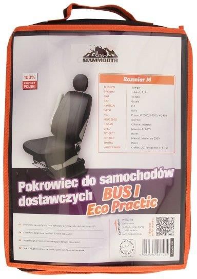 Pokrowiec na pojedyncze siedzenie w samochodach dostawczych w którym materiałem wiodącym jest bardzo wytrzymała ekoskóra produkowana w 100% w Polsce. Materiał ten zapewniadoskonałą ochronę oryginalnej tapicerki przed uszkodzeniami oraz zabrudzeniami. Produkt jest mocowany za pomocą dużej ilości haczyków oraz szerokich gumek które gwarantują perfekcyjne dopasowanie pokrowca do siedzenia. Pokrowiec można stosować zarówno w przypadku standardowych foteli jak i foteli wyposażonych w poduszki powietrzne. Ekoskóra z której zrobione są pokrowce jest materiałem który jest bardzo elastyczny od skóry naturalnej, jest łatwa do utrzymania w czystości - wystarczy przetrzeć mokrą szmatką aby pozbyć się zabrudzeń. Pokrowiec Eco Practic bardzo dobrze chroni siedzenia przed wszelakiego rodzaju olejami oraz płynami, które mogą rozlać się na naszym samochodzie dzieki swojej olejoodporności oraz wodoodporności. Eleganckie wykończenia oraz dbałość o szczegóły sprawiają, że nasz produkt jest jednym z najbardziej pożądanych w danej kategorii w Europie. Rozmiar M przykładowe dopasowania Citroen Jumpy Fiat Scudo Mercedes Vito Nissan Interstar Opel Movano od 2009 Peugeot Expert Renault Master do 2009 Volkswagen Transporter T4,T5
