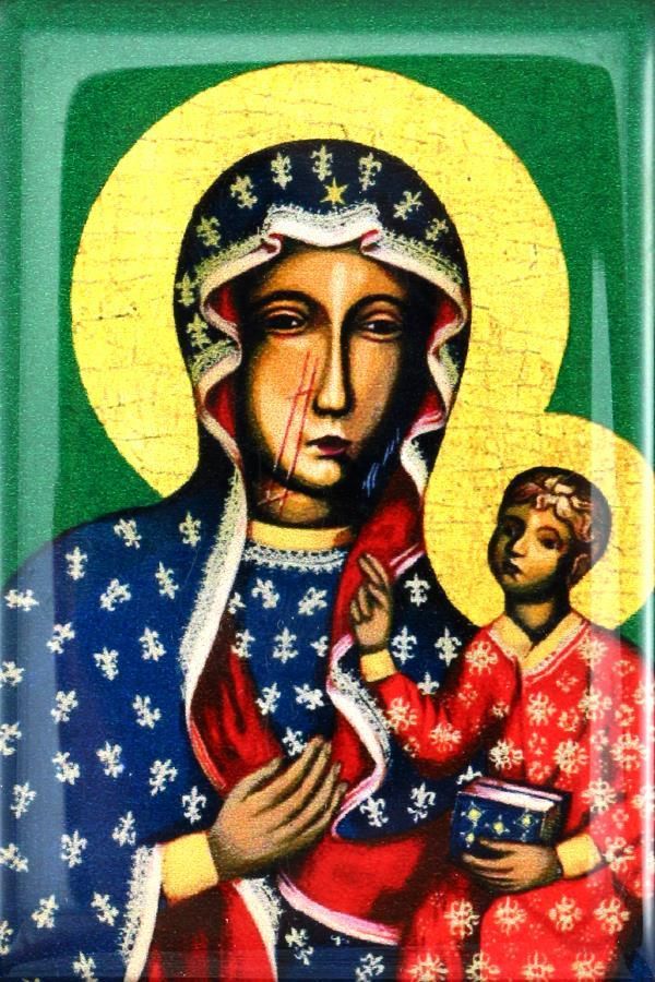 Magnes przedstawia ikonę Matki Bożej Częstochowskiej. Jest delikatnie wypukły, zabezpieczony warstwą żywicy. Ten pięknie wykonany gadżet może być zarówno wyjątkowym drobnym upominkiem dla bliskiej osoby, jak również trafionym zakupem dla siebie. Można go umieścić np. na drzwiach lodówki.