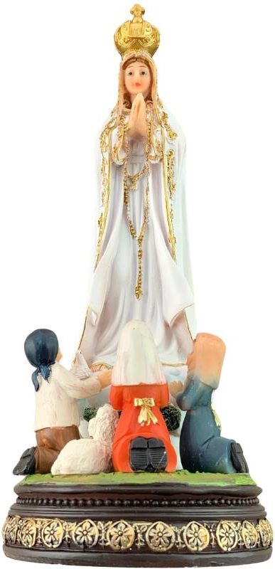 Figurka z tworzywa sztucznego, przedstawiająca Matkę Bożą z Fatimy z dziećmi. Wysokość: 25 cm
