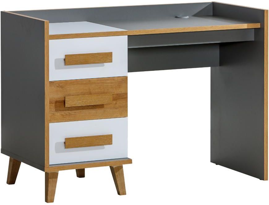 BIURKO WERSO 8 BIAŁY BRYLANTOWY / DĄB RIVIERA / ANTRACYT sprawdzi się doskonale w każdym gabinecie, biurze oraz pokoju dziecka. Głównym elementem konstrukcji mebla jest trwały stelaż wykonany z tworzywa sztucznego. Blat z płyty laminowanej o wymiarach 120x55 cm, nadający całemu biurku modernistyczny charakter powstał z połączenia barw - białego brylantu i antracytu oraz obrzeża w kolorze dębu riviera. Świetnym i praktycznym uzupełnieniem biurka są trzy szuflady wyposażone w uchwyty. BIURKO WERSO 8 BIAŁY BRYLANTOWY / DĄB RIVIERA / ANTRACYT idealnie harmonizuje z innymi meblami i dodatkami, tworząc wyjątkową atmosferę domowego biura.