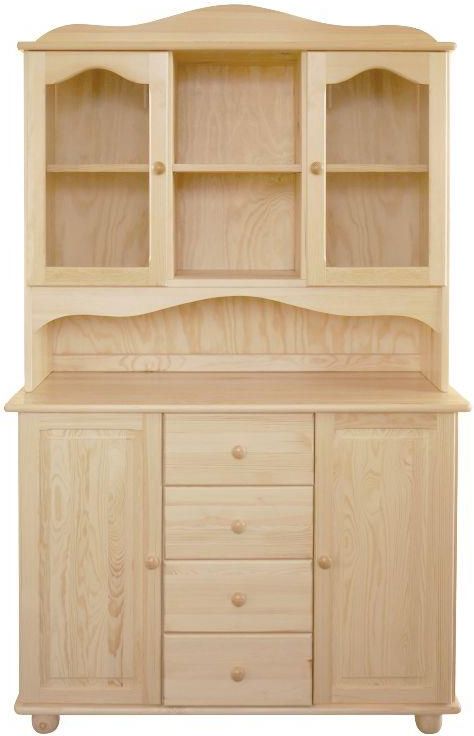 Kredens nr 28. Wykonany w całości z drewna sosnowego, plecy z płyty pilśniowej . Dolna cześć bardzo pakowna 2 zamykane szafki + 4 pakowne szuflady. Górna częśc oszklone 2 półki + 1 otwarta. Kredens jest lakierowany lakierem bezbarwnym metodą natryskową w opcji koloru jest bejcowany na kolor następnie lakierowany lakierem bezbarwnym metodą natryskową Mebel wysyłany w paczce do samodzielnego montażu wraz z instrukcją oraz akcesoriami . Wymiary kredensu : Szerokość 118 cm wysokość 190 cm głębokość 47cm(dół), 35cm(góra)