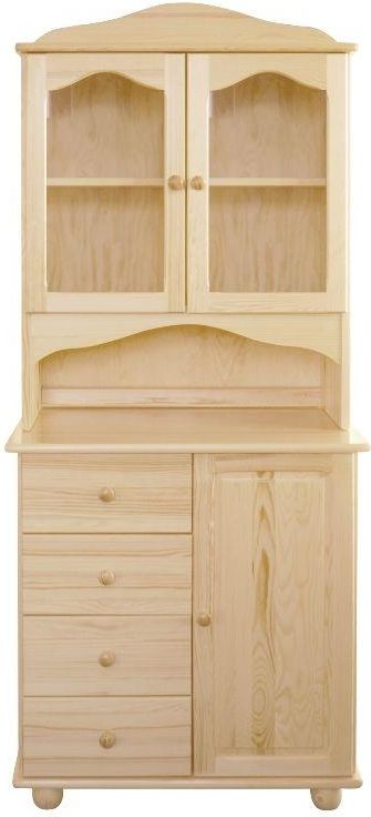 Kredens nr 30. Wykonany w całości z drewna sosnowego, plecy z płyty pilśniowej . Dolna cześć bardzo pakowna 1 zamykana szafka + 4 pakowne szuflady. Górna częśc oszklone półki Kredens jest lakierowany lakierem bezbarwnym metodą natryskową w opcji koloru jest bejcowany na kolor następnie lakierowany lakierem bezbarwnym metodą natryskową Mebel wysyłany w paczce do samodzielnego montażu wraz z instrukcją oraz akcesoriami . Wymiary kredensu : Szerokość 80 cm wysokość 190 cm głębokość 47cm(dół), 35cm(góra)