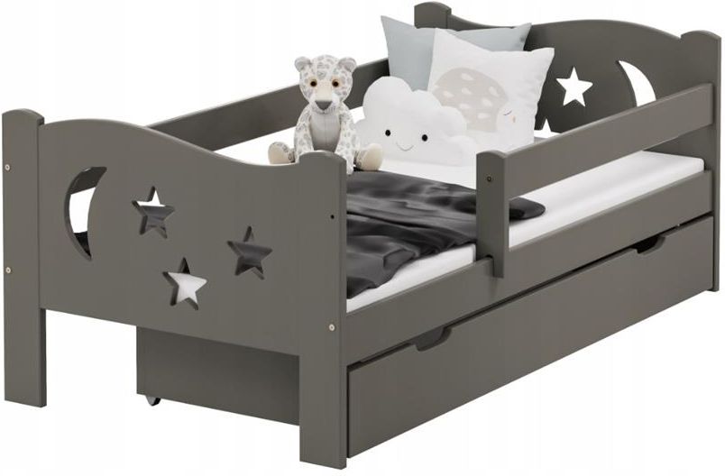 Łóżko sosnowe Gwiazdki 80x140 SZARE Łóżeczko dziecięce Gwiazdki wykonane jest z płyty MDF. W produkcji mebli na pierwszym miejscu stawiamy na jakość wykonania oraz wytrzymałość dlatego materiał jaki wykorzystujemy jest starannie selekcjonowany, tak aby konstrukcja była bezpieczna w użytkowaniu, a jednocześnie służyła przez wiele lat. Wymiary łóżeczka -Szerokość zewnętrzna 86 cm -Długość zewnętrzna 145 cm -Szerokość wewnętrzna 80 cm -Długość wewnętrzna 140 cm -Prześwit pod łóżkiem 19 cm -Szerokość listew 9,5 cm -Grubość listew +/- 2,5 cm -Wysokość łóżka 58,5 cm -Wysokość od stelaża do krawędzi łóżka 4,5 cm -Grubość nóg 2,5 cm x 9,5 cm -Stabilność całej konstrukcji zapewnia zastosowanie materiału o grubości 2,5 cm oraz szerokiego na 9,5 cm. Cechy łóżka Gwiazdki Prosty, intuicyjny montaż przez zastosowanie połączenia: śruby + drewniane kołki. Wszystkie krawędzie fazowane co daje kilka korzyści takich jak: bezpieczeństwo, estetyka, trwałość i funkcjonalność. Barierka ochronna z możliwością wyboru strony montażu zapewnia bezpieczeństwo podczas snu. Stelaż składający się z 12 listew, wykonany z naturalnego drewna o wymiarach listew 6 cm x 2 cm Wykorzystanie lakieru, który jest bezpieczny dla zdrowia oraz spełnia normy bezpieczeństwa. Oferta zawiera łóżko Gwiazdki 80x140, (stelaż, barierka ochronna) zestaw montażowy z kluczykiem instrukcja montażu W skład oferty nie wchodzi szuflada oraz inne dodatki widoczne na zdjęciach.