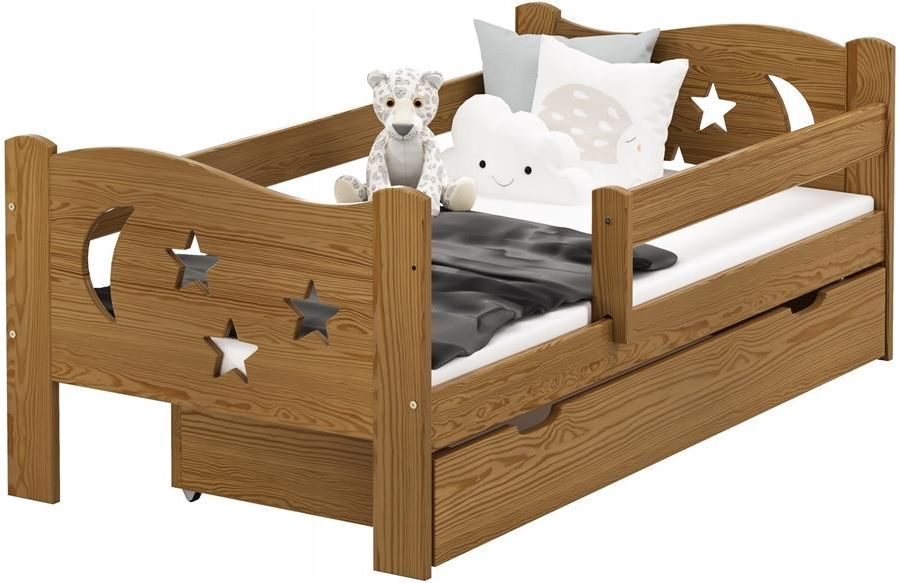 Łóżko sosnowe Gwiazdki 80x180 DĄB Łóżeczko dziecięce Gwiazdki wykonane zostało w całości z naturalnego drewna sosnowego. W produkcji mebli na pierwszym miejscu stawiamy na jakość wykonania oraz wytrzymałość dlatego materiał jaki wykorzystujemy jest starannie selekcjonowany, tak aby konstrukcja była bezpieczna w użytkowaniu, a jednocześnie służyła przez wiele lat. Wymiary łóżeczka -Szerokość zewnętrzna 86 cm -Długość zewnętrzna 185 cm -Szerokość wewnętrzna 80 cm -Długość wewnętrzna 180 cm -Prześwit pod łóżkiem 19 cm -Szerokość listew 9,5 cm -Grubość listew +/- 2,5 cm -Wysokość łóżka 58,5 cm -Wysokość od stelaża do krawędzi łóżka 4,5 cm -Grubość nóg 2,5 cm x 9,5 cm -Stabilność całej konstrukcji zapewnia zastosowanie materiału o grubości 2,5 cm oraz szerokiego na 9,5 cm. Cechy łóżka Gwiazdki Wykonane z naturalnego drewna sosnowego. Prosty, intuicyjny montaż przez zastosowanie połączenia: śruby + drewniane kołki. Wszystkie krawędzie fazowane co daje kilka korzyści takich jak: bezpieczeństwo, estetyka, trwałość i funkcjonalność. Barierka ochronna z możliwością wyboru strony montażu zapewnia bezpieczeństwo podczas snu. Stelaż składający się z 12 listew, wykonany z naturalnego drewna o wymiarach listew 6 cm x 2 cm Wykorzystanie lakieru, który jest bezpieczny dla zdrowia oraz spełnia normy bezpieczeństwa. Oferta zawiera łóżko Gwiazdki 80x180, (stelaż, barierka ochronna) zestaw montażowy z kluczykiem instrukcja montażu W skład oferty nie wchodzi szuflada oraz inne dodatki widoczne na zdjęciach.