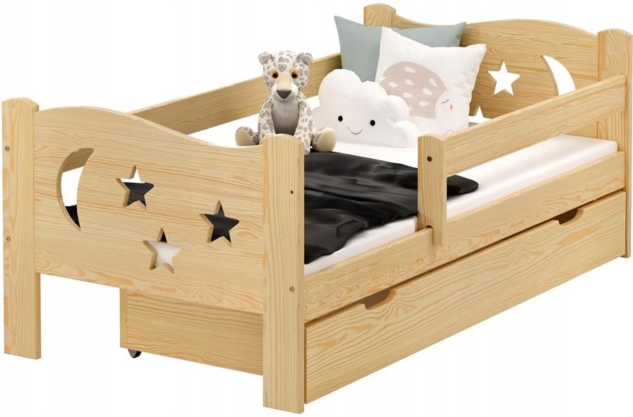 Łóżko sosnowe Gwiazdki 80x180 SOSNA Łóżeczko dziecięce Gwiazdki wykonane zostało w całości z naturalnego drewna sosnowego. W produkcji mebli na pierwszym miejscu stawiamy na jakość wykonania oraz wytrzymałość dlatego materiał jaki wykorzystujemy jest starannie selekcjonowany, tak aby konstrukcja była bezpieczna w użytkowaniu, a jednocześnie służyła przez wiele lat. Wymiary łóżeczka -Szerokość zewnętrzna 86 cm -Długość zewnętrzna 185 cm -Szerokość wewnętrzna 80 cm -Długość wewnętrzna 180 cm -Prześwit pod łóżkiem 19 cm -Szerokość listew 9,5 cm -Grubość listew +/- 2,5 cm -Wysokość łóżka 58,5 cm -Wysokość od stelaża do krawędzi łóżka 4,5 cm -Grubość nóg 2,5 cm x 9,5 cm -Stabilność całej konstrukcji zapewnia zastosowanie materiału o grubości 2,5 cm oraz szerokiego na 9,5 cm. Cechy łóżka Gwiazdki Wykonane z naturalnego drewna sosnowego. Prosty, intuicyjny montaż przez zastosowanie połączenia: śruby + drewniane kołki. Wszystkie krawędzie fazowane co daje kilka korzyści takich jak: bezpieczeństwo, estetyka, trwałość i funkcjonalność. Barierka ochronna z możliwością wyboru strony montażu zapewnia bezpieczeństwo podczas snu. Stelaż składający się z 12 listew, wykonany z naturalnego drewna o wymiarach listew 6 cm x 2 cm Wykorzystanie lakieru, który jest bezpieczny dla zdrowia oraz spełnia normy bezpieczeństwa. Oferta zawiera łóżko Gwiazdki 80x180, (stelaż, barierka ochronna) zestaw montażowy z kluczykiem instrukcja montażu W skład oferty nie wchodzi szuflada oraz inne dodatki widoczne na zdjęciach.