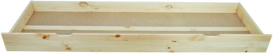 Szuflada pod łóżko Ninio 158 cm sosna. Wykonana w całości z drewna sosnowego. Dno wykonane jest w płyty pilśniowej. Jeździ po po podłodze na kółeczkach , kółka nie niszczą podłogi. Szuflada jest lakierowana lakierem bezbarwnym metodą natryskową Mebel wysyłany jest w paczce do samodzielnego montażu wraz z instrukcją oraz akcesoriami . Wymiary szuflady : szerokość 158 cm wysokość 18,5 cm głębokość 70 cm Szuflada nie pasuje do łóżek o wymiarach 120 cm szerokości.