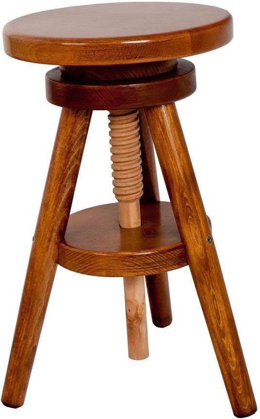 Taboret Regulowany na śrubie kolor dąb. Wykonany w całości z drewna bukowego. Prosta stabilna konstrukcja. Taboret jest lakierowany trzy krotnie , w opcji koloru jest bejcowana na kolor następnie lakierowana lakierem bezbarwnym metodą natryskową. Taboret wysyłany jest w całości. Wymiary toboretu : wysokość zakres regulacji 50-69 cm średnica 30 cm Śruba taboretu i prowadnica śruby wykonane są z drewna, co za tym idzie próby okręcania siedziska z dociskiem ciężaru mogą wywołać skrzypienie.