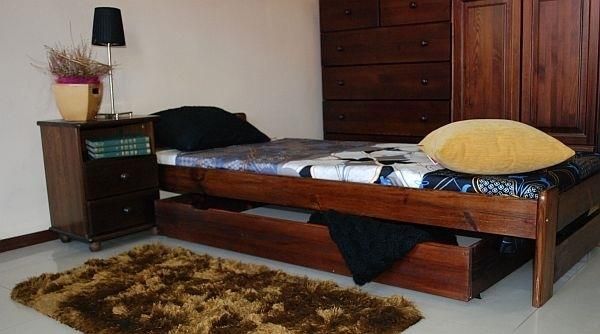 Zestaw Figaro 80x200 + materac sprężynowy orzech Zestaw zawiera łóżko sosnowe Figaro 80x200 w kolorze orzech i materac sprężynowy. ŁÓŻKO: -grubość deski : 2,6 cm -wymiar wew : 80x200 cm -wymiar zew : 87x205 cm -wysokość czółka przy nogach : 34 cm -wysokość czółka przy głowie : 50 cm -wysokość od podłogi do spodu łóżka : 20 cm . MATERAC: -budowa materac średnio twardy, jednostronny. -wkład -sprężyna bonnellowa. -pokrowiec niepikowany, zdejmowany do prania, zamek wszyty z trzech stron, co ułatwia jego ściąganie i pranie Zestaw nie zawiera dodatków typu : szuflada, szafki nocne i reszta produktów z aranżacji.
