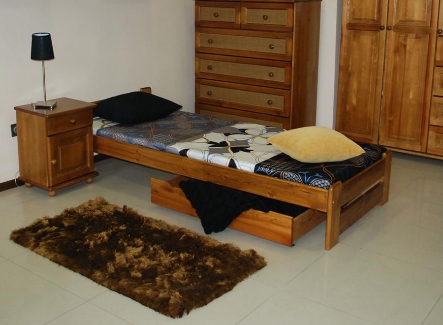 Zestaw Figaro 90x200 + materac sprężynowy DĄB Zestaw zawiera łóżko sosnowe Figaro 90x200 w kolorze dębowym i materac sprężynowy. ŁÓŻKO: -grubość deski : 2,6 cm -wymiar wew : 90x200 cm -wymiar zew : 97x205 cm -wysokość czółka przy nogach : 34 cm -wysokość czółka przy głowie : 50 cm -wysokość od podłogi do spodu łóżka : 20 cm . MATERAC: -budowa materac średnio twardy, jednostronny. -wkład -sprężyna bonnellowa. -pokrowiec niepikowany, zdejmowany do prania, zamek wszyty z trzech stron, co ułatwia jego ściąganie i pranie