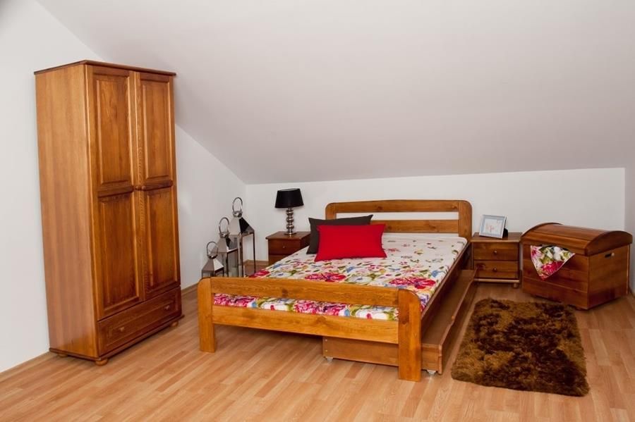Zestaw Ted 160x200 + materac piankowy DĄB Zestaw zawiera łóżko sosnowe Ted 160x200 w kolorze dębowym i materac piankowy. ŁÓŻKO: -grubość deski : 2,6 cm -wymiar wew : 160x200 cm -wymiar zew : 167x205 cm -wysokość czółka przy nogach : 50 cm -wysokość czółka przy głowie : 70 cm -wysokość od podłogi do spodu łóżka : 20 cm . MATERAC: -budowa materac średnio twardy, dwustronny. -pokrowiec niepikowany, zdejmowany do prania, zamek wszyty z trzech stron, co ułatwia jego ściąganie i pranie, -dwustronny - możliwość użytkowania materaca z dwóch stron Zestaw nie zawiera dodatków typu : szuflada, szafki nocne i reszta produktów z aranżacji.
