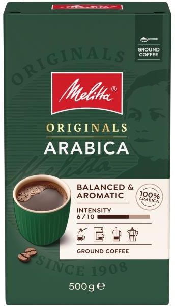 Melitta Kawa Mielona Originals Arabica 500g Kawa mielona Melitta Originals Arabica 500g Specyfikacja produktu: Typ: kawa mielona Rodzaj: 100% arabika Intensywność: średnia Stopień palenia: średni Zawartość kofeiny: niska Nuty smakowe: czekolada Opakowanie: 500g Data palenia kawy: 2025-10-16 Data przydatności: 2027-06-16 Kawa mielona Melitta Originals Arabica to zmielone ziarna średnio palonej stuprocentowej arabiki. Zbalansowany smak, w którym wyczuwalne są nuty czekoladowe, wraz z przyjemnym aromatem sprawiają, że każda minuta z tą kawą to prawdziwa chwila relaksu.Kawa Melitta Originals Arabica 500g jest przeznaczona do kawiarek, zaparzaczy typu french press oraz parzenia metodą tradycyjną bezpośrednio w kubku lub filiżance.