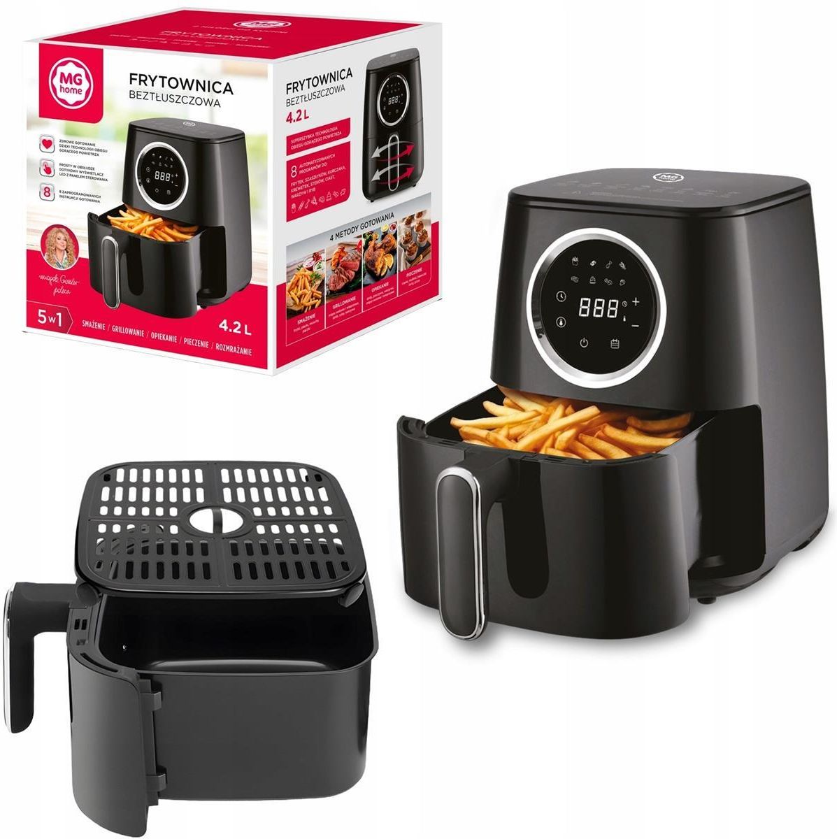 Frytkownica BEZTŁUSZCZOWA Frytownica AIR FRYER 1400W Duży Kosz 4,2 Lit. Wyświetlacz LCD MG HOME 4453 Frytownica beztłuszczowa 5w1 air fryer 4.2 L czarna 1400W MG Home Marzysz o chrupiących frytkach, soczystym kurczaku i pysznym warzywnym stir-fry – bez wyrzutów sumienia? Frytkownica beztłuszczowa Air Fryer 4.2 L to idealne rozwiązanie dla każdego, kto chce jeść zdrowiej, nie rezygnując z ulubionych smaków. Dzięki technologii cyrkulacji gorącego powietrza potrawy są chrupiące z zewnątrz i miękkie w środku – zupełnie jak z tradycyjnego oleju, ale bez tłuszczu! Właściwości 8 automatycznych programów, 5 funkcji w jednym urządzeniu - pieczenie, opiekanie, smażenie, grillowanie, rozmnażanie, Wyjmowany kosz z nieprzywierającą powłoką – łatwe czyszczenie i użytkowanie, Kompaktowy i nowoczesny design – elegancka czarna obudowa pasuje do każdej kuchni, Wyświetlacz LCD i dotykowe przyciski czyni urządzenie wygodnym w użytkowaniu, Bezpieczne użytkowanie – antypoślizgowe nóżki, chłodna w dotyku rączka, ochrona przed przegrzaniem, Niski poziom tłuszczu lub jego brak, zapewnia nowy punkt widzenia na przyrządzanie potraw, Powietrze o wysokiej temperaturze służy do podgrzewania materiałów spożywczych w cyklu trójwymiarowym, co zapewnia równomierne podgrzewanie żywności bez obracania, skutecznie i szybko, oraz zachowuje chrupki smak, Estetyczny wygląd - połączenie czerni z kolorem srebra, Urządzenie pakowane w oryginalny karton - to doskonały pomysł na prezent, Moc 1400W. Pojemność 4,2 litra Co możesz przygotować? Złociste frytki bez tłuszczu Panierowane skrzydełka z kurczaka Pieczone warzywa Mini pizze, zapiekanki, kotlety Desery – np. muffinki, ciastka, jabłka pieczone Pieczona ryba