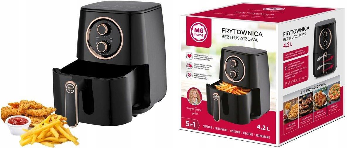 Zdrowe gotowanie w gorącym powietrzu Superszybka cyrkulacja gorącego powietrza sprawia, że potrawy są równomiernie dopieczone przy użyciu zaledwie kilku kropli oliwy. Dzięki temu możesz cieszyć się lżejszymi, chrupiącymi daniami każdego dnia, nie rezygnując z ulubionego smaku. Intuicyjna obsługa dwoma pokrętłami Regulator czasu 5 – 60 min oraz temperatury 80 – 200 °C pozwala błyskawicznie ustawić idealne warunki smażenia. Na górze obudowy nadrukowano 8 ikon z podpowiedziami najczęstszych potraw, co upraszcza dobór parametrów nawet początkującym kucharzom Rodzinny kosz 4,2 l i moc 1400 W Pojemna szuflada pomieści porcję frytek lub kurczaka dla całej rodziny, a wydajny element grzewczy grzewczy o mocy 1400 W szybko nagrzewa wnętrze, skracając czas oczekiwania na posiłek. Powierzchnia kosza i rusztu odprowadzającego tłuszcz nie przywiera do potraw, więc wystarczy ciepła woda z łagodnym detergentem, by przywrócić sprzęt do czystości; zewnętrzną obudowę przetrzesz wilgotną ściereczką. Bezpieczeństwo pod kontrolą Nienagrzewający się uchwyt, antypoślizgowe nóżki i schowek na przewód ułatwiają obsługę i przechowywanie. Wylot wentylacyjny z tyłu korpusu skutecznie odprowadza gorące powietrze, a automatyczna pauza po wyjęciu kosza pozwala bezpiecznie potrząsnąć zawartością w połowie cyklu.