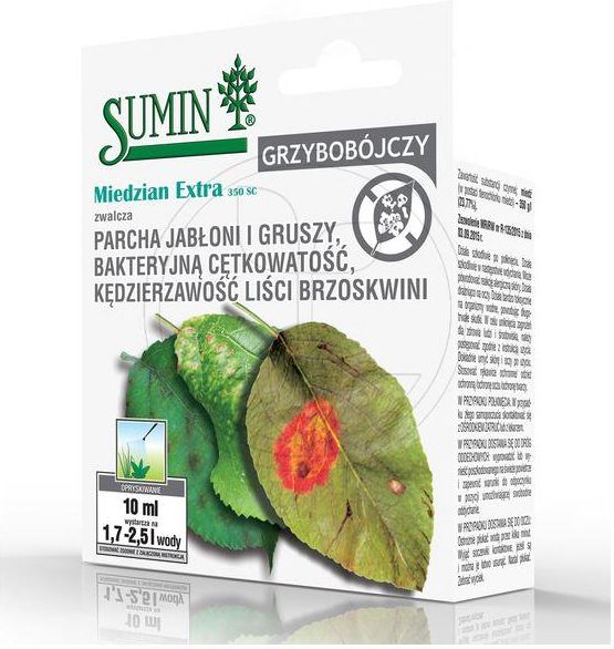 MIEDZIAN EXTRA 350 SC 10ML SUMIN EKOLOGICZNY ŚRODEK GRZYBOBÓJCZY ZWALCZAJĄCY CHOROBY GRZYBOWE I BAKTERYJNE, M.IN. PARCHA JABŁONI I ZARAZĘ ZIEMNIAKA OWOCÓW I WARZYW Fungicyd o działaniu powierzchniowym w formie koncentratu w postaci stężonej zawiesiny do rozcieńczania wodą. Przeznaczony do stosowania zapobiegawczego w ochronie przed chorobami grzybowymi w amatorskiej uprawie drzew owocowych niskopiennych i roślin warzywnych w ogrodach działkowych i przydomowych. Środek przeznaczony wyłącznie do stosowania punktowego przy użyciu opryskiwaczy ręcznych o pojemności do 10 l. Należy wykluczyć opryskiwacze z napędem spalinowym lub elektrycznym. Produkt do stosowania w rolnictwie ekologicznym. Substancja czynna miedź (w postaci tlenochlorku miedzi ) – 350 g/l (23,77%). Dawkowanie - jak stosować Miedzian Extra 350 SC Sumin? Przykładowe uprawy: Pomidor (uprawa w gruncie) ► bakteryjna cętkowatość pomidora, zaraza ziemniaka 2 - 2,5 ml środka w 0,7 l wody / 10 m2. Pomidor (pod osłonami) ► bakteryjna cętkowatość pomidora, zaraza ziemniaka 0,3% (3 ml środka w 1 litrze wody), ilość cieczy użytkowej: 1,2 l / 10 m2. Ogórek (w gruncie) ► bakteryjna kanciasta plamistość 2 - 2,5 ml środka w 0,7 l wody / 10 m2. Brzoskwinia ► kędzierzawość liści brzoskwini 7,0 ml środka w 0,7 l wody / 10 m2. Jabłoń i grusza ► parch jabłoni, parch gruszy 1,5 ml środka w 0,5 - 0,75 l wody / 10 m2. Grusza ► zaraza ogniowa ​w okresie kwitnienia: 1,5 ml środka w: 0,5 - 0,75 l wody / 10 m2. w okresie wzrostu owoców: 0,75 ml środka w 0,5 - 0,75 l wody / 10 m2. Miedzian Extra 350 SC Sumin stosowany jest w ochronie: warzyw i owoców. Miedzian Extra 350 SC Sumin zwalcza: choroby grzybowe i bakteryjne, m.in.: parcha jabłoni i gruszy, kędzierzawość liści brzoskwini, raka bakteryjnego, zarazę ogniową, szarą pleśń, antraknozę, mączniaka rzekomego, zarazę ziemniaka. Korzyści stosowania: środek ekologiczny, działanie zapobiegawcze, do stosowania w działkowych i przydomowych ogrodach. Miedzian Extra 350 SC Sumin - zalecenia stosowania Środek do stosowania przez użytkowników nieprofesjonalnych. Środek do stosowania punktowego przy użyciu opryskiwaczy ręcznych. ​W czasie kwitnienia roślin uprawnych zaleca się stosować środek poza okresami aktywności pszczół. Rośliny należy opryskiwać punktowo w taki sposób, aby zostały dokładnie zwilżone, ale nie tworzyły sie na nich krople. Przed użyciem przeczytać instrukcje podane w załączonej ulotce. UWAGA! Ze środków ochrony roślin należy korzystać z zachowaniem bezpieczeństwa. Przed użyciem przeczytaj etykietę oraz opis działania produktu. Środki ochrony roślin do użytku profesjonalnego mogą być nabyte tylko i wyłącznie przez osoby pełnoletnie oraz posiadające kwalifikacje wymagane od osób nabywających środki ochrony roślin określone w ustawie o środkach ochrony roślin. Niespełnienie powyższych warunków jest złamaniem regulaminu sklepu.