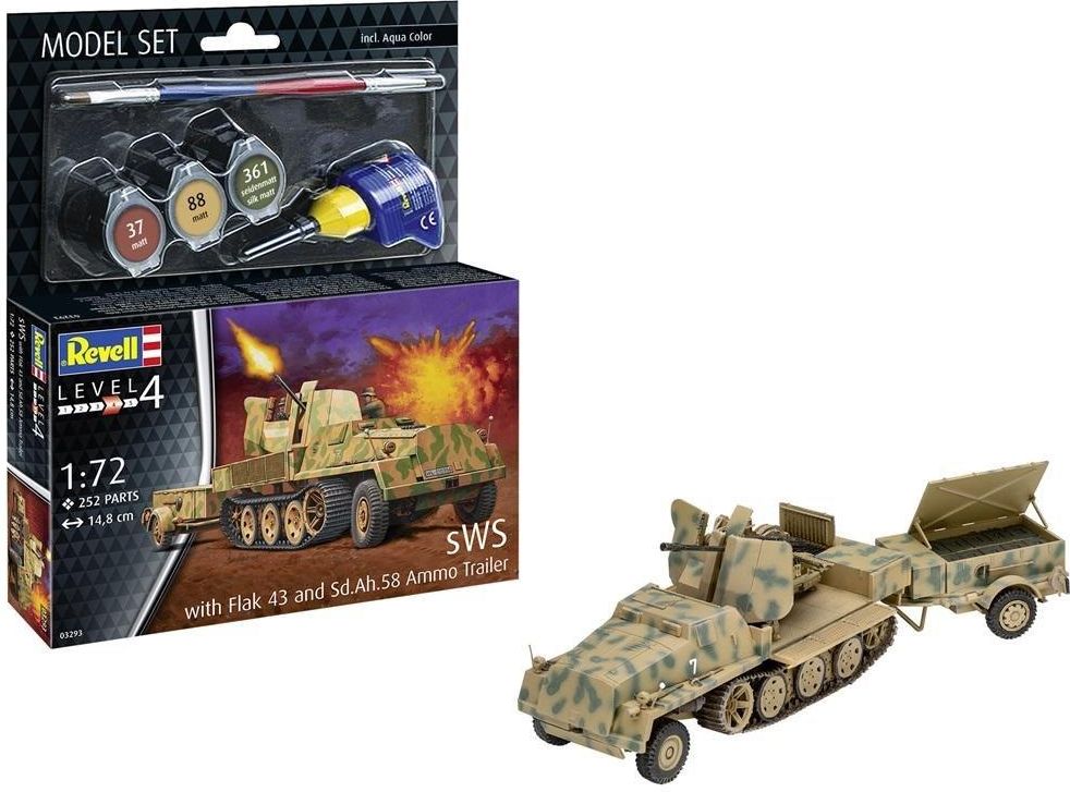 Model Revell SWS Flak 43 & Sd.Ah 58 Ammo (nr katalogowy: 63293) w skali 1:72 to zestaw do sklejania typu Model Set, który odtwarza niemiecką półgąsienicową ciężarówkę Schwerer Wehrmachtschlepper (sWS) z zamontowaną działem przeciwlotniczym Flak 43. Model ten został stworzony z myślą o …