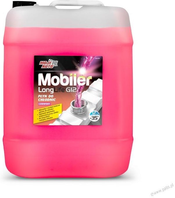 MOJE AUTO MOBILER LONG LIFE G12 CZERWONY PŁYN DO CHŁODNIC -35°C - 20kg Nr katalogowy: 61-010 Nowoczesny płyn do chłodnic z wbudowanym lejkiem do wszystkich marek i rodzajów samochodów. WŁAŚCIWOŚCI PRODUKTU Nowoczesny płyn do chłodnic samochodowych gotowy do użycia cechujący się wysokimi parametrami użytkowymi. Może być mieszany z innymi płynami do chłodnic wykonanymi na bazie glikolu etylenowego niezależnie od koloru. Zapewnia optymalną temperaturę pracy w każdych warunkach – unikalna receptura chroni silnik przed przegrzaniem w okresie letnim oraz przed zamarznięciem płynu w układzie w okresie zimowym. Zapewnia optymalną temperaturę pracy silnika przez cały rok. Działa do temperatury -35°C. Do wszystkich rodzajów chłodnic – produkt przeznaczony jest do stosowania w chłodnicach wykonanych z aluminium oraz innych stopów metali. Pełna ochrona silnika – specjalny pakiet dodatków antykorozyjnych i uszlachetniających zapobiega korozji układu chłodzenia zapewniając prawidłową pracę silnika przez wiele lat. Certyfikat zgodności – Mobiler spełnia rygorystyczne normy amerykańskie ASTM D 3306 i ASTM D 2570 oraz normę PN-C 40007. Najwyższa jakość płynu została potwierdzona certyfikatem Instytutu Transportu Samochodowego w Warszawie SPOSÓB UŻYCIA Otwieranie kanistra: Podnieść uchwyty na korku i pociągnąć do góry, aż do pojawienia się lejka. Odkręcić nakrętkę na lejku i usunąć plombę. Po nalaniu płynu - zakręcić nakrętkę na lejek i schować lejek. Usuń stary płyn z układu chłodzenia a następnie dokładnie wypłucz cały układ chłodzący czystą wodą lub specjalnym środkiem do płukania chłodnic. Napełnij układ nowym płynem Mobiler do poziomu zalecanego przez producenta samochodu. Zazwyczaj jest on określony na zbiorniku wyrównawczym. Uruchom silnik i odpowietrz układ chłodzenia zgodnie z zaleceniami producenta samochodu. Uzupełnij płyn w zbiorniku wyrównawczy do wymaganego poziomu. UWAGA wymiany płynu w układzie chłodzenia silnika należy dokonywać zgodnie z zaleceniami serwisowymi producenta i tylko na „zimnym” silniku.