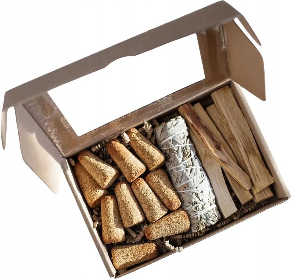 Zestaw HARMONIA palo santo drewienka 50g palo santo stożki 10 szt szałwia biała - pęk średni ZESTAW HARMONIA W skład zestawu wchodzą: Palo santo drewienka Nanga 50 g Palo santo (Bursera graveolens), nazywane “świętym drzewem”, występuje naturalnie na terenach Ameryki Środkowej oraz Ameryki Południowej i jest integralną częścią tamtejszej kultury minimum od czasów inkaskich. Jego drewno nasycone jest olejkiem eterycznym o niezwykłym, niedającym się zapomnieć zapachu, który paruje i unosi się wraz z ulatniającym się dymem w trakcie kadzenia. Ludność lokalna wykorzystuje palo santo podczas rytuałów oczyszczających i ceremonii szamańskich, a także jako roślinę leczniczą. Palo santo stożki 10 szt Palo santo w nowej odsłonie. Zachowuje się jak typowe kadzidełko stożkowe: wystarczy, że odpalisz je i pozostawisz na żaroodpornej podstawce. Posiada niezwykle intensywny aromat. Biała Szałwia – pęk średni Szałwia biała (Salvia apiana) występuje naturalnie w Kaliforni (USA) oraz Kaliforni Dolnej (Meksyk), a z racji na jej dużą popularność, uprawiana jest także w innych krajach. Tradycyjnie używana była przez Indian Czumaszów z południowej Kalifornii, jako roślina rytualna oraz lecznicza, m.in. jako środek uspokajający, moczopędny oraz lekarstwo na przeziębienie. Zdobyła sławę przede wszystkim jako roślina sakralna. Indianie wierzą, że ma ona wielką moc oczyszczania i przywracania równowagi duszy. Używają jej w formie kadzidła podczas wszelkich ceremonii do oczyszczania przestrzeni z negatywnych wpływów; jej dym wydziela subtelną, słodko-ziołową woń.