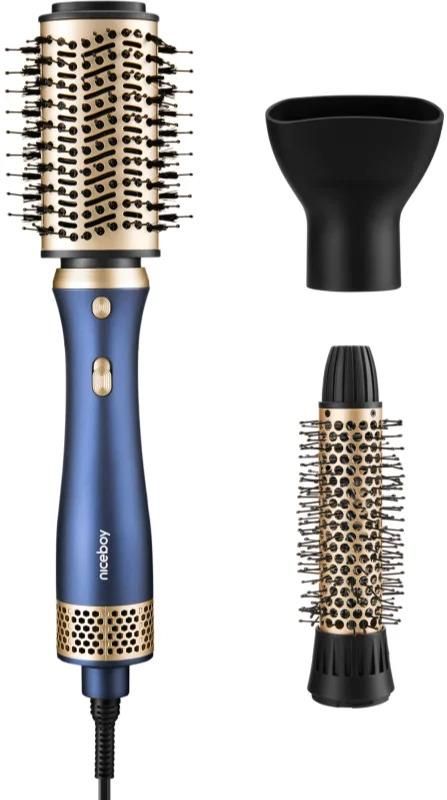 Niceboy AirBlow, 1 szt., lokówka do włosów dla kobiet, Podczas układania włosów nie musisz mieć rąk pełnych pracy, trzymając w jednej ręce suszarkę, a w drugiej okrągłą szczotkę. Powinien wystarczyć Ci jeden praktyczny pomocnik, jakim jest lokówko-suszarka Niceboy AirBlow . Dzięki temu wszechstronnemu urządzeniu do stylizacji, które jednocześnie pełni funkcję suszarki do włosów, okrągłej szczotki, lokówki i grzebienia możesz stylizować fryzurę już podczas suszenia włosów. Łatwo i szybko możesz uzyskać pożądany look, mniej lub bardziej falowane włosy lub naturalnie prostą fryzurę. Dzięki ciepłemu powietrzu przepływającemu przez otwory w nasadce będziesz mogła jednocześnie suszyć i modelować włosy. Zapewni Ci idealny wygląd jak z salonu oraz możliwość wyboru stylu w zależności od nastroju. Codzienna stylizacja włosów stanie się dla Ciebie zabawą. Zawartość zestawu: Niceboy AirBlow lokówko-suszarka 1 szt. szczotka do formowania fal 1 szt. koncentrator 1 szt. szczotka na gorące powietrze 1 szt. Właściwości: suszy i stylizuje włosy oferuje wiele możliwości stylizacji idealna do stylizacji puszystych fal nadaje włosom objętość sprawia, że włosy stają się gładkie i błyszczące do każdego rodzaju włosów w pakiecie dostępne różne nakładki i końcówki Sposób użycia: Postępuj zgodnie z załączoną instrukcją użycia.