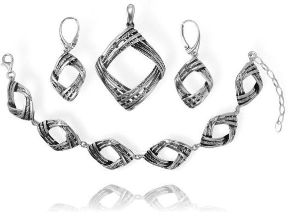 Srebrny Oksydowany Fantazyjny Komplet Próba 925 Waga - Bransoletka 14,9 g. Wisiorek ~ 6,1 g. Kolczyki 6,8 g.Długość - Bransoletka 17,5 cm. z przedł. łańcuszkowym do 22 cm. Wisiorek 5,4 cm. z zawieszką Kolczyki 4,6 cm.Szerokość - Bransoletka 1,6 cm. Wisiorek 3,5 cm. Kolczyki 1,9 cm. KUPUJĄC BIŻUTERIĘ U MNIE OTRZYMUJĄ PAŃSTWO !!! ✅ Towar Zgodny z Najwyższą Sztuką Jubilerską !!! ✅ Biżuterię Przebadaną i Podbitą Przez Urząd Probierczy !!! ✅ Do Biżuterii Dołączona Jest Metka Jubilerska Potwierdzająca Próbę (nie ma na niej ceny) ✅ Zakupiona Biżuteria Wysyłana jest w Estetycznym Opakowaniu Dopasowanym do Wybranego Asortymentu ✅ Biżuterię Wysyłamy Tylko Przesyłkami Ubezpieczonymi ! Zapraszam serdecznie !!!