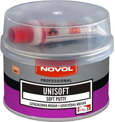 Novol UNISOFT Szpachlówka miękka - wypełniająca Wypełniająca szpachlówka o bardzo szerokim zastosowaniu. Przeznaczona do nakładania w grubych warstwach, doskonale uzupełnia nawet duże ubytki. Może być stosowana zarówno do obróbki ręcznej jak i mechanicznej. Posiada bardzo dobrą przyczepność do różnych rodzajów podłoża tj. stali węglowej, aluminium, stali ocynkowanej, starych powłok. Wysoka elastyczność minimalizuje ryzyko pękania nawet na dużych powierzchniach. Kluczowe cechy łatwa w obróbce ręcznej i mechanicznej dobra przyczepność do różnych rodzajów podłoża, w tym ocynku oraz starych powłok wysoka trwałość i odporność na pękanie dzięki elastycznej żywicy doskonale nadaje się do aplikacji na mniejszych i większych powierzchniach Podłoża laminaty poliestrowe przeszlifować na sucho P80 – P120 i ponownie odtłuścić Zmywaczem do usuwania silikonu PLUS 780. stal odtłuścić, przeszlifować na sucho P80 – P120 i ponownie odtłuścić. stal ocynkowana odtłuścić, zmatowić włókniną ścierną i ponownie odtłuścić aluminium odtłuścić, zmatowić włókniną ścierną i ponownie odtłuścić podkłady akrylowe dwukomponentowe odtłuścić, przeszlifować na sucho P220 – P280 i odtłuścić stare powłoki lakierowe odtłuścić, przeszlifować na sucho P220 – P280 i odtłuścić