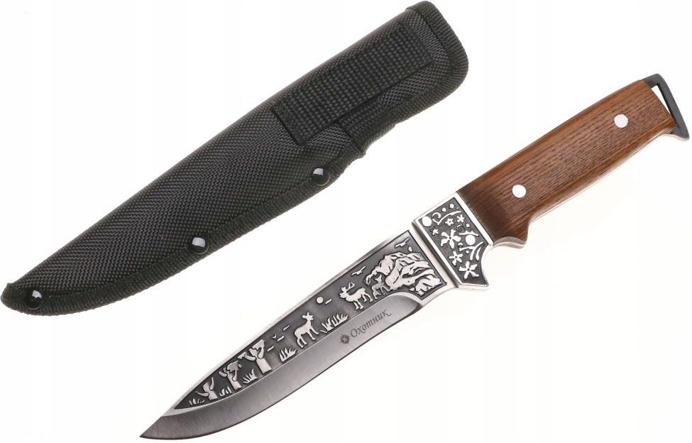 Nóż myśliwski Głownia typu Drop point utwardza sztych dzięki czemu nóż bardzo dobrze tnie. Idealny nóż myśliwski, ale również roboczy Cechy produktu: Nóż wykonany z wysokiej jakości grubej stali Bardzo ostry W górnej części ostrza oraz rękojeści ozdobny grawer Wygodnie leży w dłoni Głownia typu Drop point Rękojeść typu full tang (pełny trzpień) Uchwyt z drewnianych nakładek Jelec chroni przed ześlizgnięciem się dłoni Bardzo solidne wykonanie Stalowa głowica z otworem na linkę Długość ostrza: 12 cm Długość noża: 26 cm W zestawie materiałowy pokrowiec