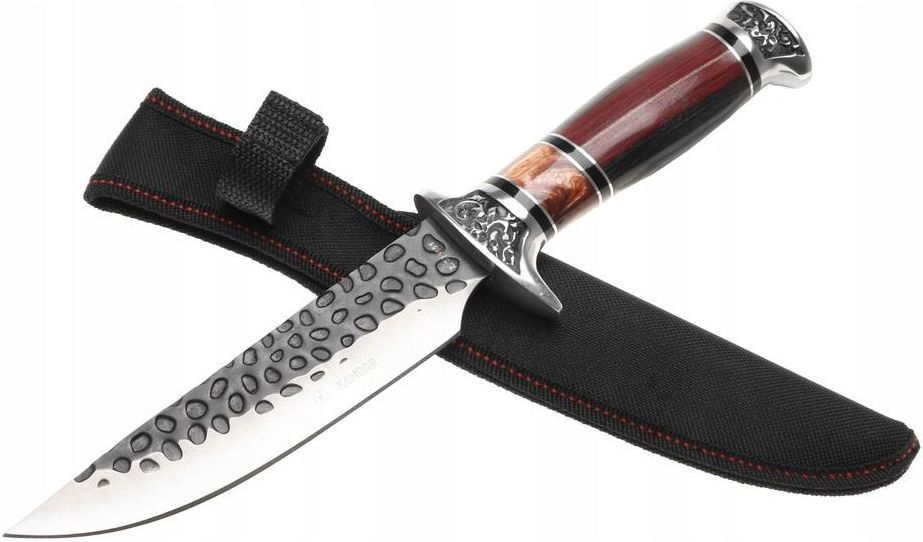 Nóż myśliwski Głownia typu Straight back dobrze nadaje się do cięcia i siekania. Nóż sprawdza się również podczas rąbania i pchnięć Cechy produktu: Nóż wykonany z wysokiej jakości grubej stali Bardzo ostry Wygodnie leży w dłoni Głownia typu Straight back Ozdobna rękojeść typu hidden tang (ukryty trzpień) Ozdobny uchwyt z tworzywa na wzór drewna i bursztynu Bardzo solidne wykonanie Stalowa głowica Jelec chroni przed ześlizgnięciem się dłoni Długość ostrza: 15 cm Długość noża: 30,5 cm W zestawie materiałowy pokrowiec