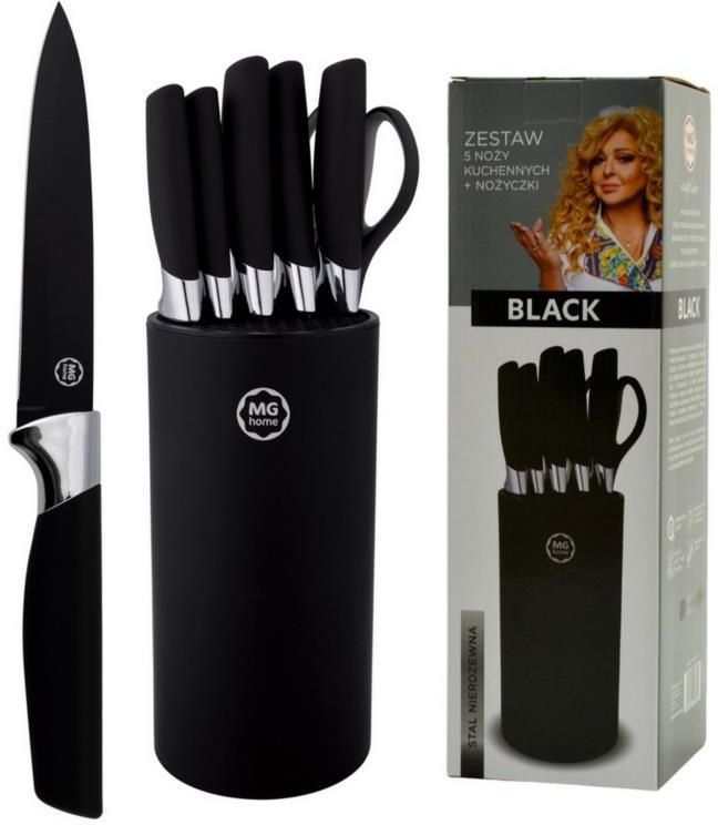 Zestaw noży w bloku MG Home Black, 7 elementów, z nożyczkami MG Home Zestaw noży kuchennych w bloku + nożyczki Black Zestaw 5 noży kuchennych z nożyczkami w bloku MG HOME Black zawiera wszystkie niezbędne narzędzia do obierania, krojenia i siekania, dzięki czemu z łatwością poradzisz sobie z każdym …