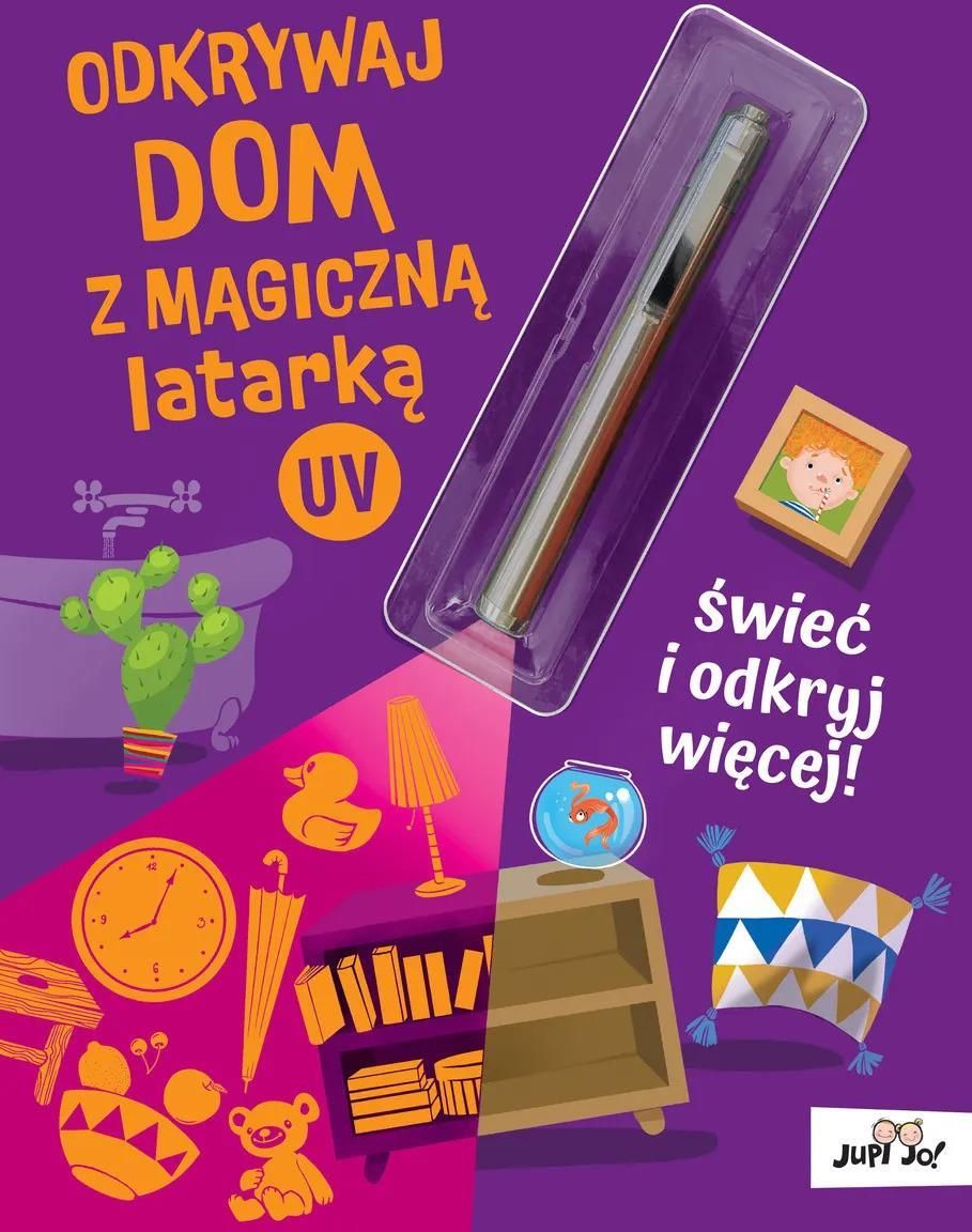 Na kolejnych stronach tej niezwykłej książki dzieci poznają poszczególne pomieszczenia domu: salon, pokój dziecięcy, kuchnię, przedpokój. Kiedy skierują światło latarki na oglądaną stronę, stanie się coś niezwykłego – na ilustracjach pojawią się elementy, które wcześniej były niewidoczne. I to w różnych kolorach! Następnie dzieci sprawdzą swoją spostrzegawczość, odpowiadając na pytania. Poszukają przedmiotów w różnych kształtach, kolorach, miejscach. Powiedzą, ile jest danych elementów i znajdą przeciwieństwa. Na koniec zobaczą zwierzęta, które ukryły się w pobliżu domu. Ta książka łączy zabawę z nauką i w naturalny sposób wspiera koncentrację oraz rozwój słownictwa. Odkryj tajemnice domu z magiczną latarką UV! Do książki jest dołączona latarka UV. Producent/osoba odpowiedzialna za bezpieczeństwo produktuWydawnictwo Jednośćul. Jana Pawła II 425-025 Kielcejednosc@jednosc.com.pl41 349 50 00
