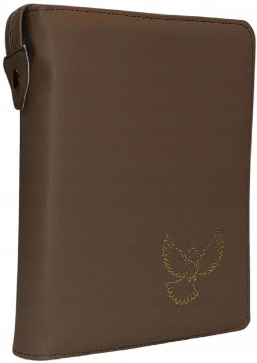 Ekskluzywne etui na Pismo Święte – w kolorze kawowym ze złoconym symbolem gołębicy Podaruj swojemu Pismu Świętemu wyjątkową oprawę, która odznacza się trwałością i elegancją. Oto etui w kawowym kolorze z subtelnym złoconym symbolem gołębicy, znakiem Ducha Świętego i Bożej obecności. Etui zaprojektowane z myślą o Biblii w formacie 16 x 22 cm (Edycja Świętego Pawła, Stary i Nowy Testament). Funkcjonalność i ochrona na najwyższym poziomie Solidne materiały: Wykonane z wytrzymałego materiału, ekoskóry, która skutecznie chroni Pismo Święte przed zabrudzeniami, zarysowaniami i codziennym zużyciem, jednocześnie zachowując estetykę na długi czas. Perfekcyjne dopasowanie: Etui zostało precyzyjnie zaprojektowane dla formatu 16 x 22 cm, dzięki czemu Biblia leży w nim idealnie i jest łatwa w użytkowaniu. Bezpieczne zapięcie: Wyposażone w solidny, płynnie działający suwak, który zabezpiecza zawartość, gwarantując wygodny dostęp do księgi. Doskonale sprawdzi się jako prezent na różne okazje: chrzest, bierzmowanie, jubileusz, uroczystości i inne.