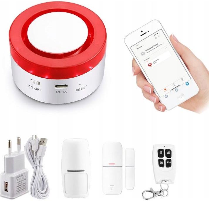 BEZPRZEWODOWA SYRENA ALARMOWA WiFi z aplikacją Tuya Smart w języku polskim Chroń swoje miejsce zamieszkania i bliskich w niezwykle mądry sposób. Zachowaj pełną kontrolę nad domem za pomocą aplikacji Tuya Smart! KONTROLUJ SWÓJ DOM ZDALNIE Miej swój dom pod kontrolą będąc w dowolnym miejscu na świecie. BEZPIECZEŃSTWO Po wykryciu ruchu przez detektor, włączy się bardzo głośna syrena alarmowa wraz z sygnalizacją LED, która jednocześnie zaalarmuje powiadomieniem w aplikacji o wykryciu intruza w Twoim mieszkaniu. DARMOWA APLIKACJA PO POLSKU Zestaw działa na Wifi za pomocą aplikacji Tuya Smart, która jest w języku polskim. AUTOMATYCZNE PLANOWANIE CZASU UZBROJENIA i ROZBROJENIA Możesz ustawić czas automatycznego uzbrojenia alarmu gdy wychodzisz z domu do pracy. Po Twoim powrocie alarm może zostać rozbrojony aż do momentu gdy nie pójdziesz spać. Wstajesz regularnie rano? Alarm zostanie rozbrojony do momentu aż nie wyjdziesz do pracy. STEROWANIE GŁOSOWE Syrena alarmowa współpracuje z Alexa oraz Google Home, dzięki czemu można sterować nią głosowo. MULTI SYRENA Naszą syrenę można połączyć z innymi produktami Tuya Smart, dzięki czemu po pojawieniu się ruchu i alarmie na jednym urządzeniu również inne urządzenia włączą alarm. MOŻLIWOŚĆ ROZBUDOWY O KOLEJNE KOMPONENTY Urządzenie umożliwia rozbudowę do 8 pilocików oraz 24 bezprzewodowych sensorów ruchów. Obszar działania wynosi do 100m na wolnym powietrzu. Bezprzewodowy czujnik ruchu Czujnik umożliwia wykrycie ruchu w pomieszczeniach. Wykrywanie ruchu opiera się na bardzo precyzyjnym pomiarze temperatury. Informacja o detekcji przekazywana jest drogą radiową. Czujnik otwarcia drzwi/okien Czujnik umożliwia wykrycie otwarcia drzwi, okna itp. Wykrycie następuje gdy dwa elementy zostaną oddalone od siebie. Pilot sterujący Za pomocą pilota można uzbroić/rozbroić alarm oraz uruchomić go w razie potrzeby. Cechy i specyfikacja Bezprzewodowy system alarmowy Napięcie pracy: DC5V Alarm dźwiękowy i za pomocą diody LED Rozbrajanie/uzbrajanie: za pomocą pilocika/aplikacji Częstotliwość pracy bezprzewodowej: 433MHz Głośność: około 110dB Poziomy głośności: Wysoki/Średni/Niski Możliwość połączenia do 8 pilocików Możliwość połączenia do 24 czujników Standard WiFi: IEEE802.11b/g/n Akumulator: 300mAh (do podtrzymania) Temperatury pracy:od -20℃ do 55℃ Aplikacja: Tuya Smart po polsku Współpracuje z: Amazon Alexa/ Google Assistance/IFTTT Wymiary syreny:65x35mm (na zdjęciu) Zestaw zawiera 1x Syrena alarmowa 1x Sensor otwarcia drzwi/okien 1x Sensor ruchu 1x Pilocik 1x Label USB 1x Ładowarka Instrukcja obsługi Oryginalne opakowanie