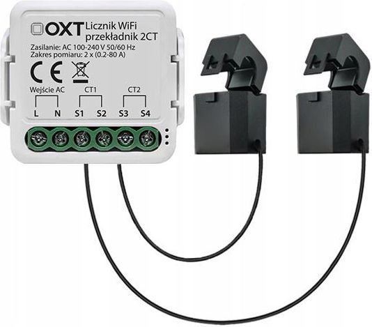 Moduł OXT mini licznik energii 2 przekładniki 80 A CT WiFi TUYA Licznik z dwoma pętlami pomiarowymi pozwala na podłączenie nawet kilku przewodów tej samej fazy do przekładnika i sprawdzanie sumarycznego zużycia prądu, jaki przez niego przepływa. Podłącz moduł OXT do zasilania i wybierz odpowiednie przewody, na których chcesz sprawdzać zużycie prądu. Ważne! Moduł OXT powinien być zasilony z tej samej fazy co przewody pomiaru. Główne zalety urządzenia: Nie wymaga ingerencji w przewód głównego zasilania, załóż pętlę CT na przewód fazowy (lub kilka przewodów), zasil urządzenie i pomiar gotowy Posiada dwie pętle pomiarowe CT 2 x 80 A Sprawdzanie zużycia prądu, bieżące (kW, W, A, V) i historyczne na wykresie (kWh) - świetna opcja dla podnajmujących lokale Precyzyjny pomiar zużycia prądu do 80 A wraz ze statystykami zużycia w aplikacji Można wysterować inne urządzenie w aplikacji TUYA na podstawie danych z licznika (m.in. energia całkowita kWh, aktualna moc W, napięcie V, dzienne zużycie kWh) Darmowa aplikacja TUYA Smart lub Smartlife dla Android oraz iOS Możliwość instalacji na szynie DIN (w zestawie adapter) Do obsługi urządzenia nie jest wymagana dodatkowa bramka. Podłącz urządzenie do swojego domowego routera WiFi i korzystaj z pełni możliwości w dowolnej lokalizacji Precyzyjne dane i inteligentne scenariusze poboru prądu Urządzenie posiada szczegółowe informacje dotyczące pomiaru prądu Twoich urządzeń. Odpowiednie dostosowanie zaawansowanych ustawień pozwoli zaoszczędzić dodatkowe koszta. Korzystaj ze statystyk poboru prądu, a także dodatkowych opcji do lepszego zarządzania prądem. Model posiada opcję wyłączenia po wykorzystaniu ustalonej liczby kWh! Pełen dostęp do ustawień mocy, zasilania i poboru prądu Rzetelne dane z wykresów Ustaw własne harmonogramy Nie zamęczaj się bieganiem wokół swoich urządzeń. Dzięki mikroprocesorowi TUYA ustawisz odpowiednio harmonogramy według własnych upodobań i codziennej rutyny. Nastaw włączanie i wyłączanie urządzenia według własnych potrzeb i oszczędzaj na prądzie! Włączaj lub wyłączaj urządzenia za pomocą harmonogramów, odliczania lub automatyzacji Do tworzenia scen można wykorzystać następujące parametry: Energia całkowita - podawane w kWh Aktualna moc - podawane w W Napięcie - podawane w V Dzienne zużycie - podawane w kWh Podłączenie licznika UWAGA! Licznik musi być zasilony z tego samego źródła, z którego zasilone jest urządzenie. Przekładnik jest kierunkowy, to znaczy, że musi zostać założony na przewodzie fazowym zgodnie z kierunkiem płynięcia prądu - prawidłowy kierunek oznaczony jest na przekładniku strzałką. Nieprawidłowe połączenie może powodować problemy z prawidłowym odczytem. Specyfikacja: Zasilanie: AC 100-240 V 50/60 Hz, pomiar do 2 x 80 A Liczba przekładników: 2 Komunikacja: WiFi 2.4 GHz 802.11 b/g/h Obudowa: ognioodporny ABS Aplikacja: TUYA (Smart Life) W zestawie: Moduł OXT mini licznik energii 2 CT WiFi TUYA 2 przekładniki 80 A CT Instrukcja obsługi Kod produktu: T232