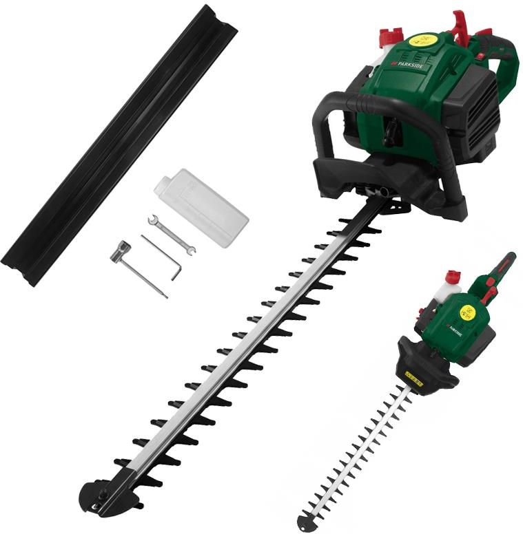 Nożyce spalinowe do żywopłotu Parkside PBHS 700 A1 Spalinowe nożyce do żywopłotu o mocy 700 W Łatwa obsługa dzięki dobremu wyważeniu i ergonomicznej konstrukcji Obracany w 5 pozycjach uchwyt do wygodnego cięcia Cechy i funkcje Moc, na którą możesz liczyć Parkside PBHS 700 A1 to spalinowe nożyce do żywopłotu stworzone z myślą o wymagających użytkownikach. Wyposażone w mocny 2-suwowy silnik benzynowy o mocy 0,7 kW (0,95 KM), oferują niezawodną pracę nawet przy gęstszych i twardszych gałęziach. Bezobsługowy zapłon elektroniczny oraz linkowy rozrusznik ułatwiają szybkie uruchomienie urządzenia, a system Easy Start z automatycznym dławikiem sprawia, że rozruch jest lekki i bezproblemowy. Precyzyjne cięcie i wysoki komfort pracy Nożyce zostały wyposażone w laserowo wycinane ostrza z hartowanej stali specjalnej, dodatkowo zabezpieczone antykorozyjnie i osadzone na trwałej aluminiowej prowadnicy. Dzięki długości cięcia 57 cm, rozstawowi zębów 28 mm oraz maksymalnej grubości cięcia do 20 mm, bez trudu poradzą sobie z formowaniem nawet rozrośniętych krzewów i żywopłotów. Czteropunktowy system antywibracyjny skutecznie redukuje przenoszenie drgań na uchwyty, co znacząco zwiększa komfort podczas dłuższej pracy. Ergonomia i elastyczność użytkowania Model PBHS 700 A1 został zaprojektowany z myślą o wygodzie – jego dobrze wyważona konstrukcja i ergonomiczny uchwyt zapewniają pewny chwyt i kontrolę nad narzędziem. Dodatkowo, uchwyt można obracać w 5 pozycjach (od -90° do +90°), co pozwala na wygodne cięcie pod różnymi kątami, zarówno w pionie, jak i poziomie. W zestawie znajduje się także solidna osłona noża, zapewniająca bezpieczne przechowywanie i transport urządzenia. Specyfikacja techniczna Producent Parkside Typ silnika chłodzony powietrzem silnik 2-suwowy (jednocylindrowy) Stopień emisji Euro 5 Mieszanka paliwowa 40:1 (40 części benzyny bezołowiowej o liczbie oktanowej co najmniej 90 na 1 część oleju do silników 2-suwowych) Moc 0,7 kW (0,95) KM Liczba skoków 3450 min-1 Długość cięcia 57 cm Maks. średnica gałęzi 20 mm Długość noża 66 cm Odstęp między nożem a zębem 28 mm Kąt obrotu -90° / -45° / 0° / +45° /+90° Pojemność skokowa silnika 25,4 cm³ Pojemność zbiornika 320 ml Materiał korpus z tworzywa sztucznego, nóż stalowy, aluminiowa szyna prowadząca Wymiary ok. 110 x 24,5 x 21 cm Waga ok. 5,2 kg Zawartość zestawu Nożyce spalinowe do żywopłotu Parkside PBHS 700 A1 1 osłona noża 1 butelka do mieszania paliwa 1 klucz do świec zapłonowych 1 podwójny klucz płaski 1 klucz imbusowy Instrukcja obsługi Oryginalne opakowanie