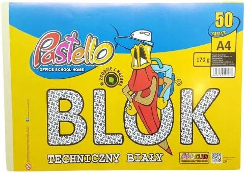 BLOK A4 TECHNICZNY BIAŁY Blok techniczny biały marki Pastello Format: A4. Ilość kartek: 50. Marka: Pastello Okładka: miękka, wielokolorowa. Gramatura: 170 g
